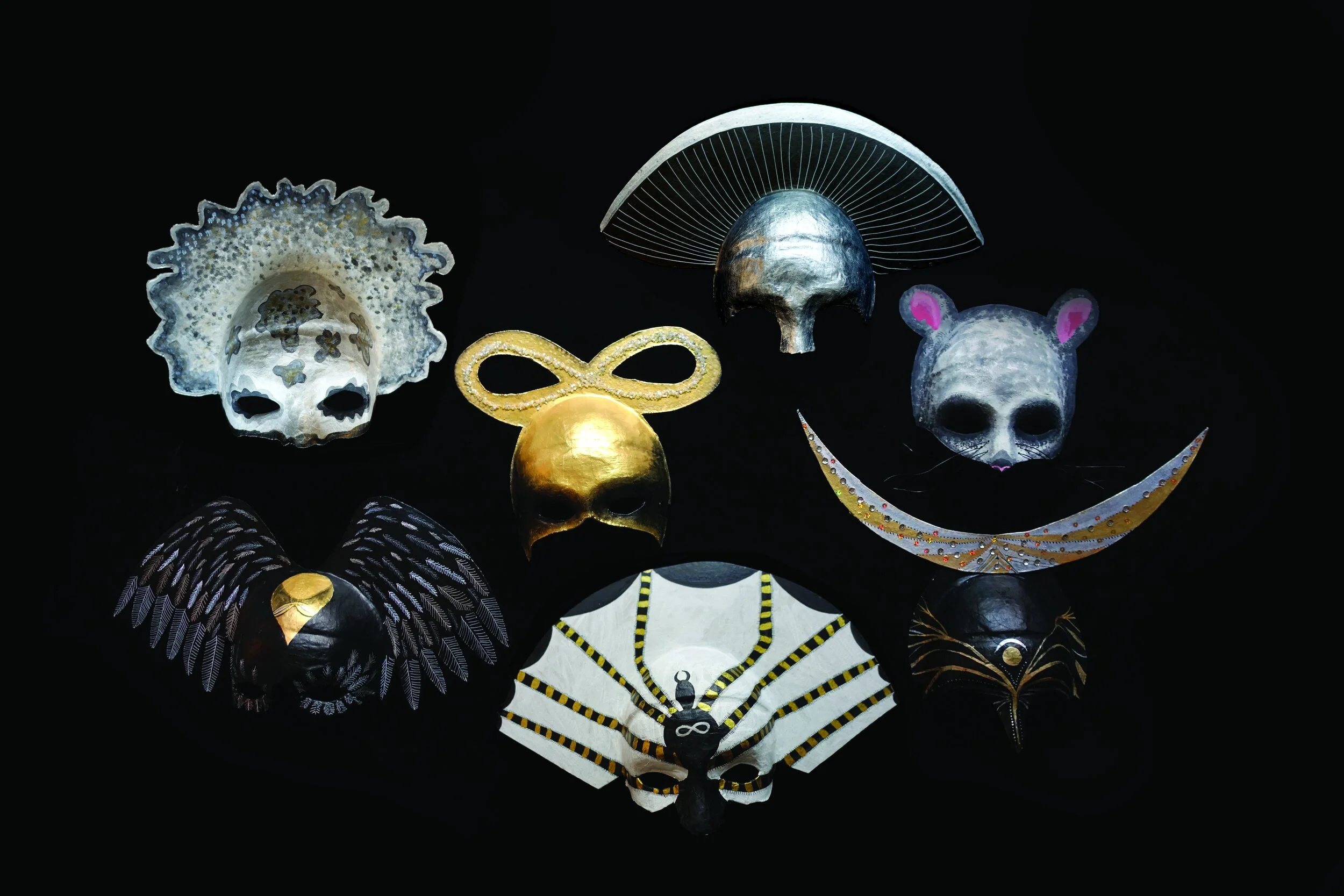 ABOVE: CREATION chorale headdresses. Found papier-mache, paint, glue, sequins, glass beads and elastic cord, dimensions variable. Photo: Deborah Kelly
